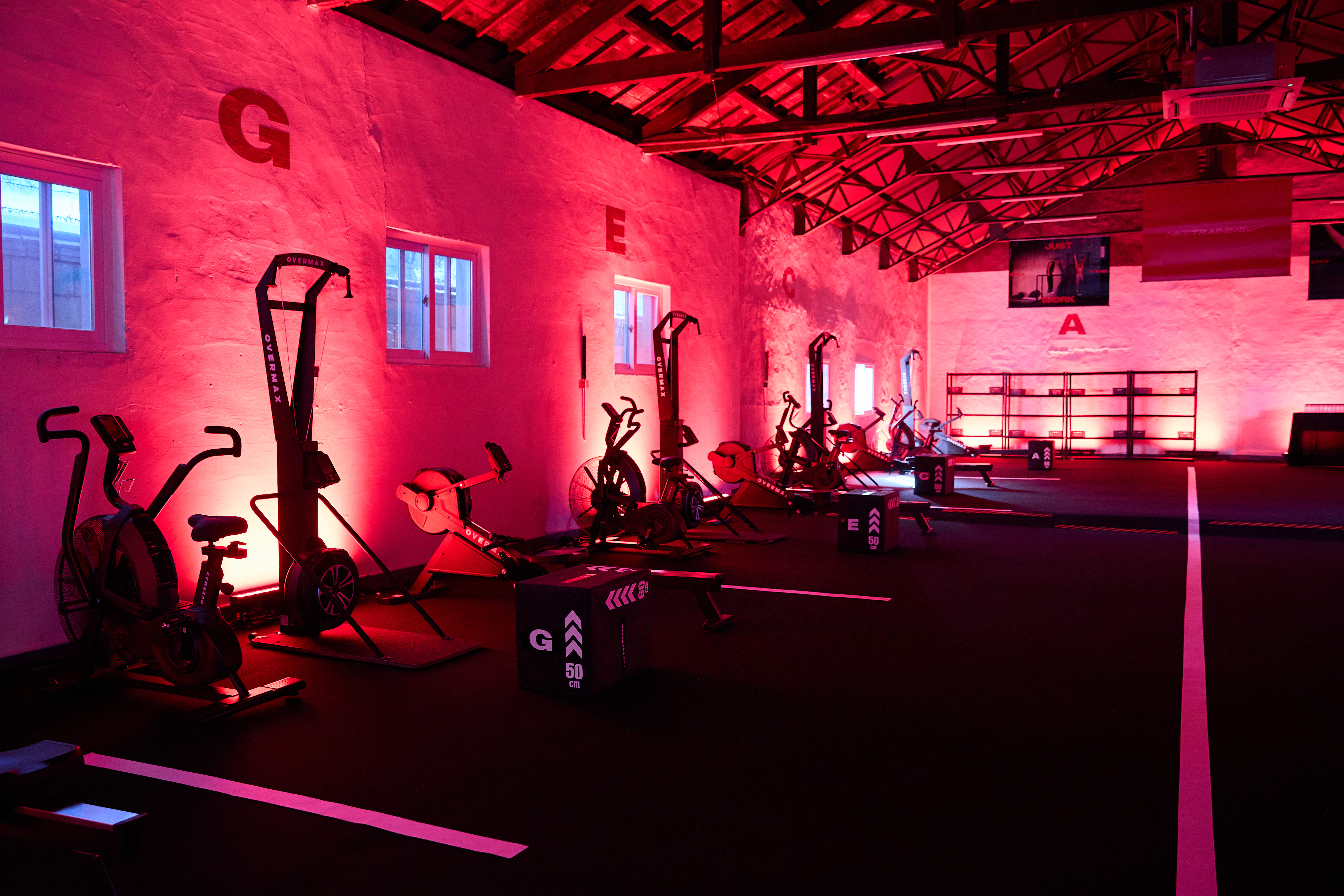 현장에 들어서자마자 느껴지는 건 '비장함'이었습니다. 폐공장 느낌의 거친 콘크리트 벽, 그리고 공간을 가득 채운 붉은 조명. 벽면에 새겨진 **"JUST DO THE WORK"**라는 슬로건은 핑계 대지 말고 움직이라는 무언의 압박처럼 느껴졌습니다.